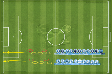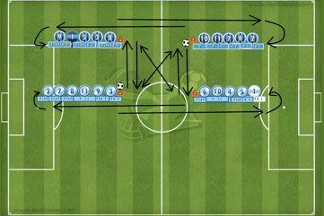 3- GR + 10 x 9 – Em campo um pouco mais largo, foi mantido o mesmo objetivo da primeira atividade, equipe em superioridade deveria manter a posse de bola e trocar 20 passes, e a equipe em inferioridade numérica deveria ser agressiva na marcação e rápida e direta para finalizar em porta, agora com um goleiro. As 4 portas laterais foram substituídas por 2 balizas centrais. Foi sempre destacado por Giampaolo a necessidade de alargar o jogo, encontrar a linha de passe e não mais de dois toques na bola. Duraçao de 20', com troca entre as equipes de 3 em 3 minutos.