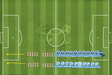 2- 10 x 8 – Em campo reduzido, a equipe em superioridade deveria manter a posse da bola o máximo possível e trocar 10 passes, antes de poder tentar o tiro em porta, enquanto a equipe em inferioridade deveria ser agressiva na marcação e quando roubassem a bola, deveriam ser rápidos e diretos para tentar o tiro em porta. Foi sempre destacado por Giampaolo a necessidade de encontrar a linha de passe e não mais de dois toques na bola. Duraçao de 15', com troca entre as equipes de 3 em 3 minutos.